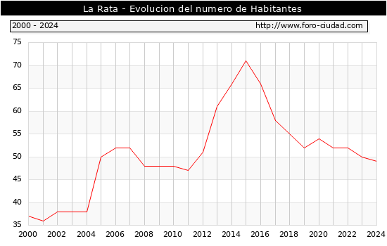 el numero de habitantes en La Rata era de 49, 1 habitantes menos que el en el año 2023. En el grafico siguiente se puede ver cuantos habitantes tiene La Rata a lo largo de los años.
