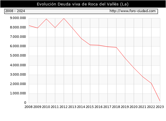 La Roca del Vallès - Deuda viva del Ayuntamiento a 31/12/2024 La Roca del Vallès - Deuda viva del Ayuntamiento a 31/12/2024 Segun el Ministerio de Economia y Hacienda el Ayuntamiento de La Roca del Vallès a 31/12/2024 posee una deuda de 44.000 € . La deuda viva a 31/12/2023 ascendia a 194.000 € por lo que en el ultimo año la deuda se redujo en -150.000 €. ![]()