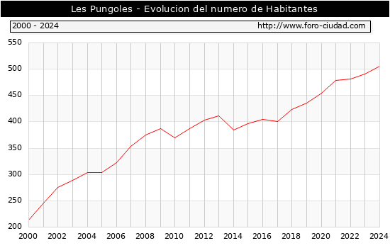 el numero de habitantes en Les Pungoles era de 505, 14 habitantes mas que el en el año 2023. En el grafico siguiente se puede ver cuantos habitantes tiene Les Pungoles a lo largo de los años.