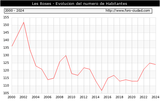 el numero de habitantes en Les Roses era de 124, 1 habitantes menos que el en el año 2023. En el grafico siguiente se puede ver cuantos habitantes tiene Les Roses a lo largo de los años.