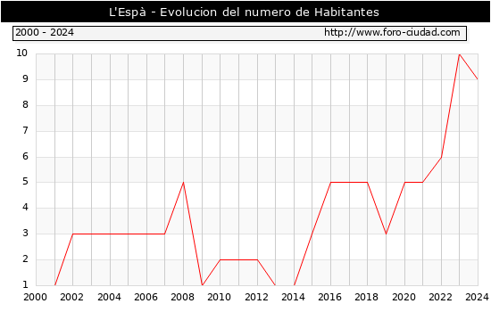 el numero de habitantes en L'Espà era de 9, 1 habitantes menos que el en el año 2023. En el grafico siguiente se puede ver cuantos habitantes tiene L'Espà a lo largo de los años.