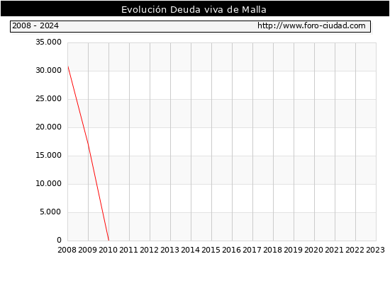 | Malla - Deuda viva del Ayuntamiento a 31/12/2024 Malla - Deuda viva del Ayuntamiento a 31/12/2024 Segun el Ministerio de Economia y Hacienda el Ayuntamiento de Malla a 31/12/2024 posee una deuda de 0 € . La deuda viva a 31/12/2023 ascendia a 0 € por lo que en el ultimo año la deuda se mantuvo igual.