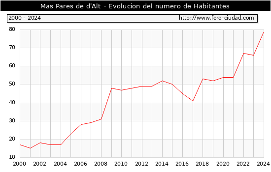 el numero de habitantes en Mas Pares de d'Alt era de 79, 13 habitantes mas que el en el año 2023. En el grafico siguiente se puede ver cuantos habitantes tiene Mas Pares de d'Alt a lo largo de los años.