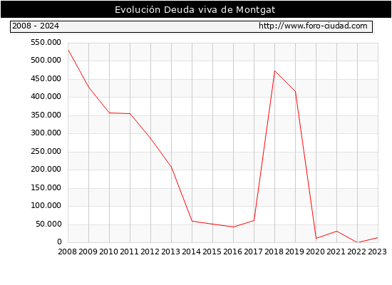 Montgat - Deuda viva del Ayuntamiento a 31/12/2024 Montgat - Deuda viva del Ayuntamiento a 31/12/2024 Segun el Ministerio de Economia y Hacienda el Ayuntamiento de Montgat a 31/12/2024 posee una deuda de 10.000 € . La deuda viva a 31/12/2023 ascendia a 14.000 € por lo que en el ultimo año la deuda se redujo en -4.000 €. ![]()