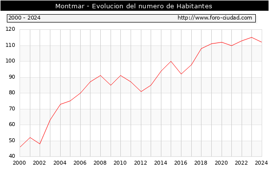 el numero de habitantes en Montmar era de 112, 3 habitantes menos que el en el año 2023. En el grafico siguiente se puede ver cuantos habitantes tiene Montmar a lo largo de los años.