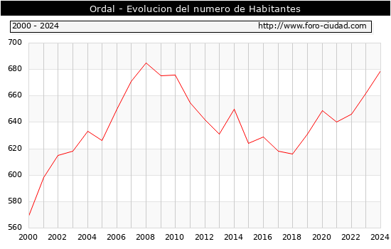 el numero de habitantes en Ordal era de 679, 17 habitantes mas que el en el año 2023. En el grafico siguiente se puede ver cuantos habitantes tiene Ordal a lo largo de los años.