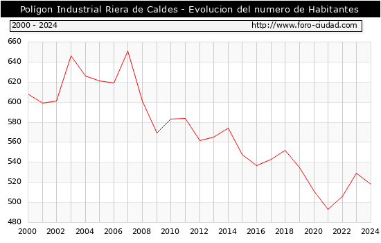 Segun los datos publicados por el INE a 1 de Enero de 2024 el numero de habitantes en Polígon Industrial Riera de Caldes era de 518, 11 habitantes menos que el en el año 2023. En el grafico siguiente se puede ver cuantos habitantes tiene Polígon Industrial Riera de Caldes a lo largo de los años.
