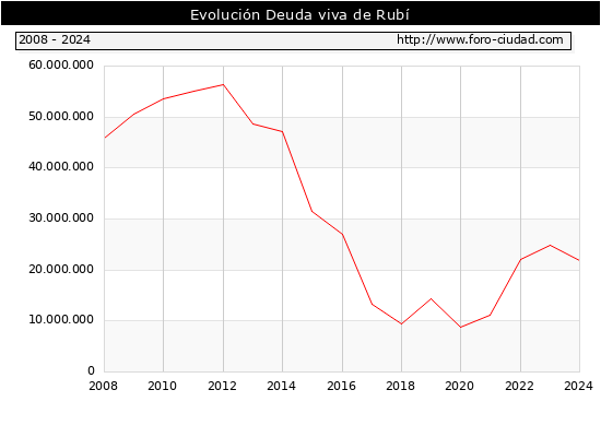 Rubí - Deuda viva del Ayuntamiento a 31/12/2024 Rubí - Deuda viva del Ayuntamiento a 31/12/2024 Segun el Ministerio de Economia y Hacienda el Ayuntamiento de Rubí a 31/12/2024 posee una deuda de 21.868.000 € . La deuda viva a 31/12/2023 ascendia a 24.888.000 € por lo que en el ultimo año la deuda se redujo en -3.020.000 €. ![]()