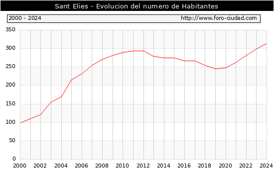 el numero de habitantes en Sant Elies era de 313, 14 habitantes mas que el en el año 2023. En el grafico siguiente se puede ver cuantos habitantes tiene Sant Elies a lo largo de los años.