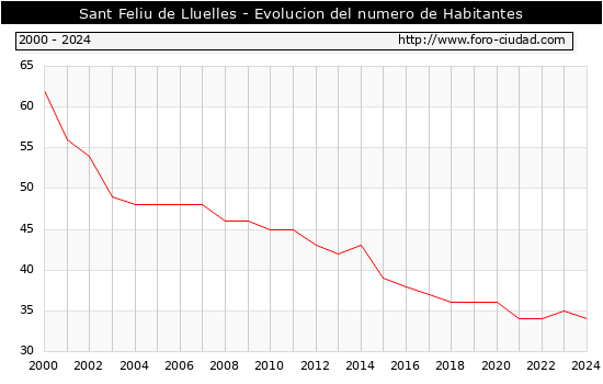 el numero de habitantes en Sant Feliu de Lluelles era de 34, 1 habitantes menos que el en el año 2023. En el grafico siguiente se puede ver cuantos habitantes tiene Sant Feliu de Lluelles a lo largo de los años.