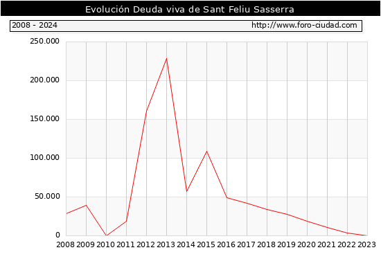 | Sant Feliu Sasserra - Deuda viva del Ayuntamiento a 31/12/2024 Sant Feliu Sasserra - Deuda viva del Ayuntamiento a 31/12/2024 Segun el Ministerio de Economia y Hacienda el Ayuntamiento de Sant Feliu Sasserra a 31/12/2024 posee una deuda de 0 € . La deuda viva a 31/12/2023 ascendia a 0 € por lo que en el ultimo año la deuda se mantuvo igual.