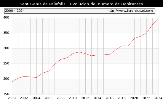 el numero de habitantes en Sant Genís de Palafolls era de 397, 19 habitantes mas que el en el año 2023. En el grafico siguiente se puede ver cuantos habitantes tiene Sant Genís de Palafolls a lo largo de los años.