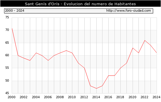 el numero de habitantes en Sant Genís d'Orís era de 61, 3 habitantes menos que el en el año 2023. En el grafico siguiente se puede ver cuantos habitantes tiene Sant Genís d'Orís a lo largo de los años.