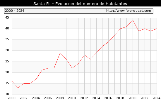 el numero de habitantes en Santa Fe era de 40, 1 habitantes mas que el en el año 2023. En el grafico siguiente se puede ver cuantos habitantes tiene Santa Fe a lo largo de los años.