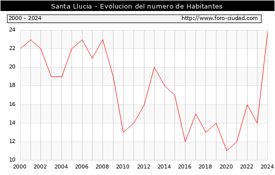 el numero de habitantes en Santa Llucia era de 24, 10 habitantes mas que el en el año 2023. En el grafico siguiente se puede ver cuantos habitantes tiene Santa Llucia a lo largo de los años.