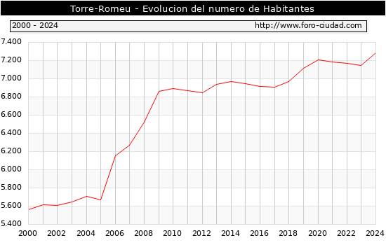 el numero de habitantes en Torre-Romeu era de 7.288, 140 habitantes mas que el en el año 2023. En el grafico siguiente se puede ver cuantos habitantes tiene Torre-Romeu a lo largo de los años.