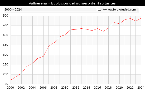 el numero de habitantes en Vallserena era de 488, 15 habitantes mas que el en el año 2023. En el grafico siguiente se puede ver cuantos habitantes tiene Vallserena a lo largo de los años.