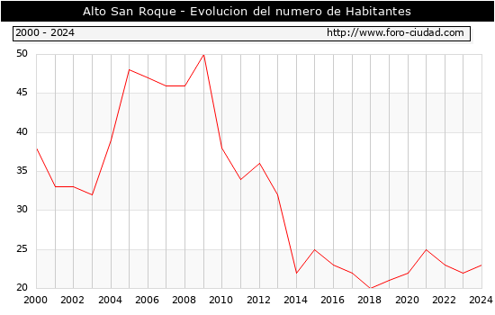el numero de habitantes en Alto San Roque era de 23, 1 habitantes mas que el en el año 2023. En el grafico siguiente se puede ver cuantos habitantes tiene Alto San Roque a lo largo de los años.