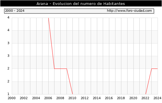 el numero de habitantes en Arana era de 2, igual numero de habitantes que el en el año 2023. En el grafico siguiente se puede ver cuantos habitantes tiene Arana a lo largo de los años.