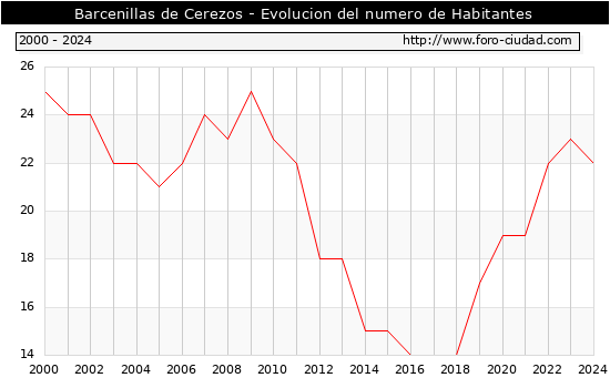 el numero de habitantes en Barcenillas de Cerezos era de 22, 1 habitantes menos que el en el año 2023. En el grafico siguiente se puede ver cuantos habitantes tiene Barcenillas de Cerezos a lo largo de los años.