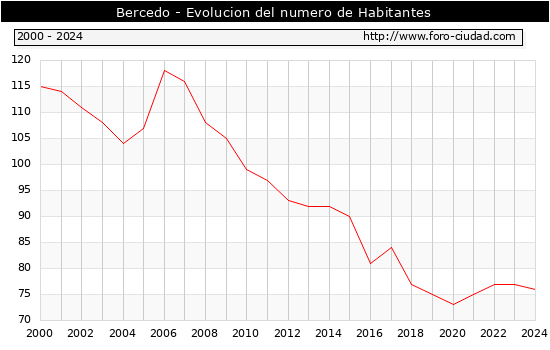 el numero de habitantes en Bercedo era de 76, 1 habitantes menos que el en el año 2023. En el grafico siguiente se puede ver cuantos habitantes tiene Bercedo a lo largo de los años.