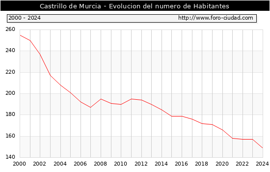 el numero de habitantes en Castrillo de Murcia era de 149, 8 habitantes menos que el en el año 2023. En el grafico siguiente se puede ver cuantos habitantes tiene Castrillo de Murcia a lo largo de los años.