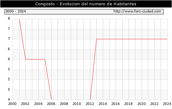 el numero de habitantes en Congosto era de 7, igual numero de habitantes que el en el año 2023. En el grafico siguiente se puede ver cuantos habitantes tiene Congosto a lo largo de los años.