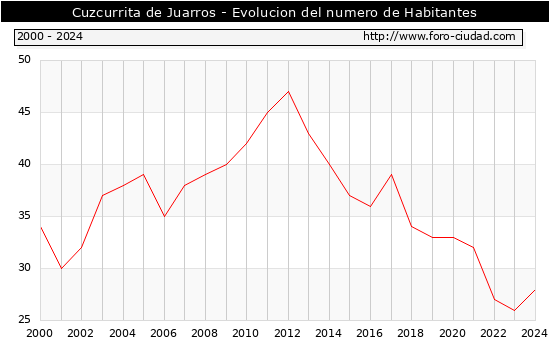 el numero de habitantes en Cuzcurrita de Juarros era de 28, 2 habitantes mas que el en el año 2023. En el grafico siguiente se puede ver cuantos habitantes tiene Cuzcurrita de Juarros a lo largo de los años.