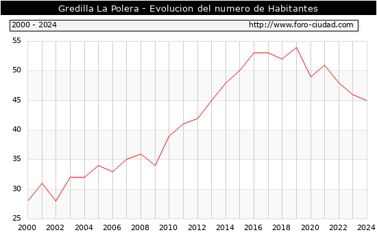 el numero de habitantes en Gredilla La Polera era de 45, 1 habitantes menos que el en el año 2023. En el grafico siguiente se puede ver cuantos habitantes tiene Gredilla La Polera a lo largo de los años.