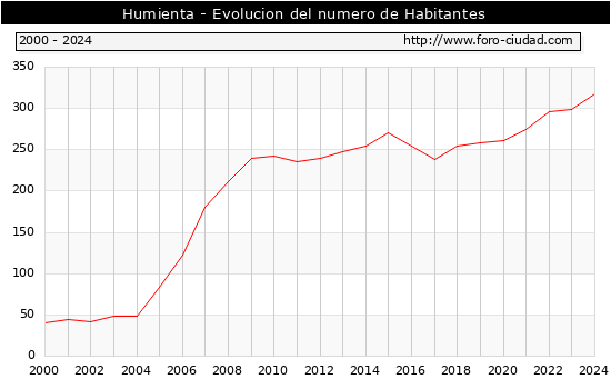 el numero de habitantes en Humienta era de 318, 19 habitantes mas que el en el año 2023. En el grafico siguiente se puede ver cuantos habitantes tiene Humienta a lo largo de los años.