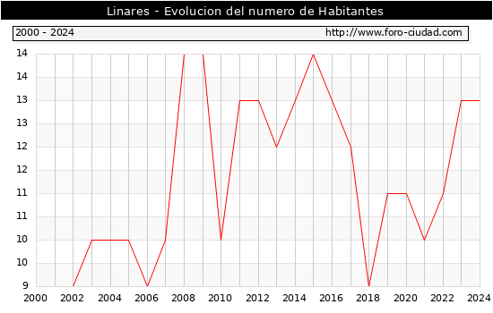 el numero de habitantes en Linares era de 13, igual numero de habitantes que el en el año 2023. En el grafico siguiente se puede ver cuantos habitantes tiene Linares a lo largo de los años.