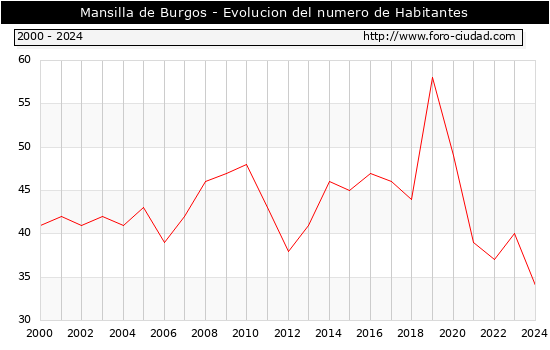 el numero de habitantes en Mansilla de Burgos era de 34, 6 habitantes menos que el en el año 2023. En el grafico siguiente se puede ver cuantos habitantes tiene Mansilla de Burgos a lo largo de los años.