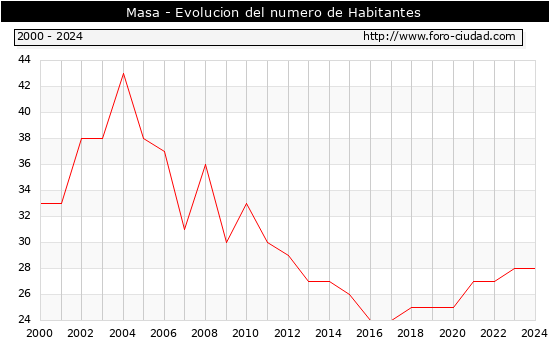 el numero de habitantes en Masa era de 28, igual numero de habitantes que el en el año 2023. En el grafico siguiente se puede ver cuantos habitantes tiene Masa a lo largo de los años.