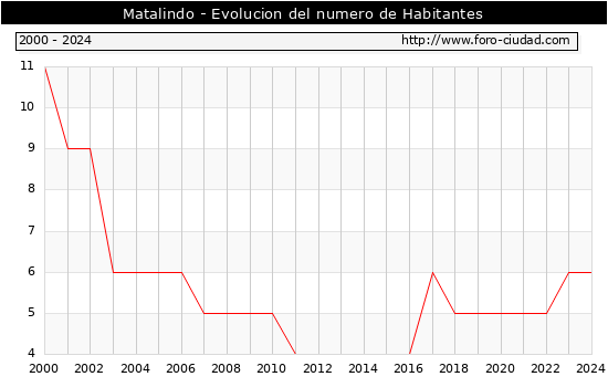 Segun los datos publicados por el INE a 1 de Enero de 2024 el numero de habitantes en Matalindo era de 6, igual numero de habitantes que el en el año 2023. En el grafico siguiente se puede ver cuantos habitantes tiene Matalindo a lo largo de los años.