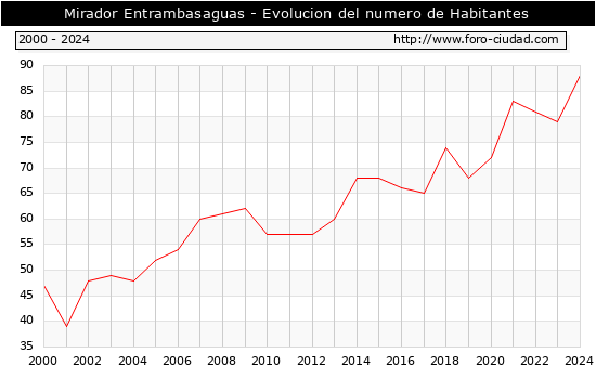 el numero de habitantes en Mirador Entrambasaguas era de 88, 9 habitantes mas que el en el año 2023. En el grafico siguiente se puede ver cuantos habitantes tiene Mirador Entrambasaguas a lo largo de los años.
