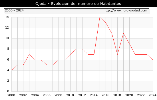 el numero de habitantes en Ojeda era de 6, 1 habitantes menos que el en el año 2023. En el grafico siguiente se puede ver cuantos habitantes tiene Ojeda a lo largo de los años.