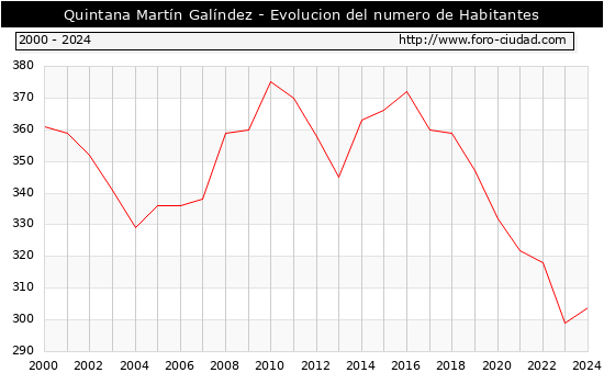 el numero de habitantes en Quintana Martín Galíndez era de 304, 5 habitantes mas que el en el año 2023. En el grafico siguiente se puede ver cuantos habitantes tiene Quintana Martín Galíndez a lo largo de los años.