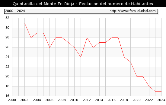 el numero de habitantes en Quintanilla del Monte En Rioja era de 17, igual numero de habitantes que el en el año 2023. En el grafico siguiente se puede ver cuantos habitantes tiene Quintanilla del Monte En Rioja a lo largo de los años.