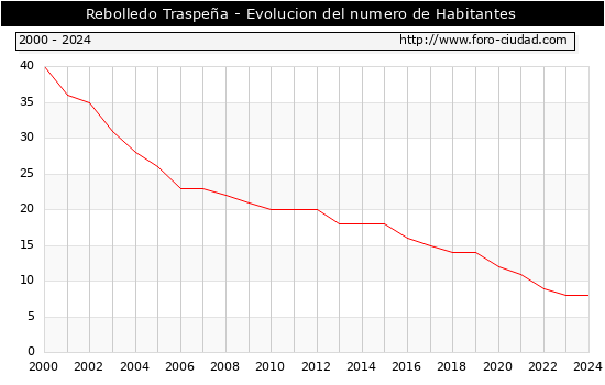 el numero de habitantes en Rebolledo Traspeña era de 8, igual numero de habitantes que el en el año 2023. En el grafico siguiente se puede ver cuantos habitantes tiene Rebolledo Traspeña a lo largo de los años.