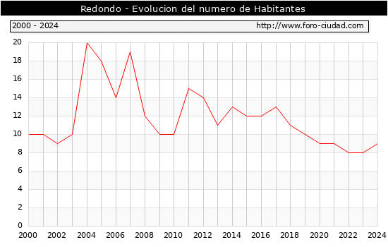 el numero de habitantes en Redondo era de 9, 1 habitantes mas que el en el año 2023. En el grafico siguiente se puede ver cuantos habitantes tiene Redondo a lo largo de los años.
