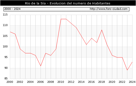 el numero de habitantes en Río de la Sía era de 93, 4 habitantes mas que el en el año 2023. En el grafico siguiente se puede ver cuantos habitantes tiene Río de la Sía a lo largo de los años.