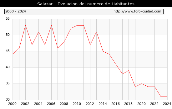 el numero de habitantes en Salazar era de 31, igual numero de habitantes que el en el año 2023. En el grafico siguiente se puede ver cuantos habitantes tiene Salazar a lo largo de los años.