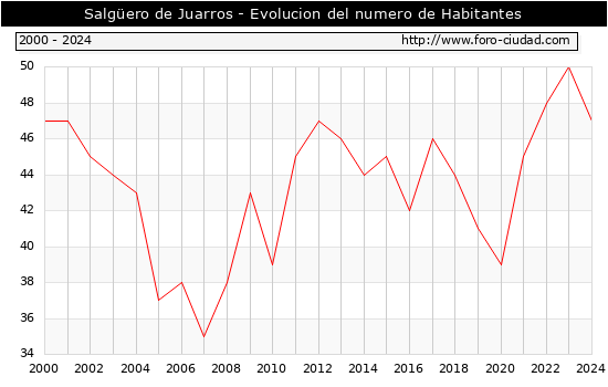 el numero de habitantes en Salgüero de Juarros era de 47, 3 habitantes menos que el en el año 2023. En el grafico siguiente se puede ver cuantos habitantes tiene Salgüero de Juarros a lo largo de los años.