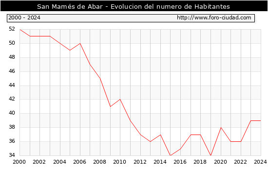 el numero de habitantes en San Mamés de Abar era de 39, igual numero de habitantes que el en el año 2023. En el grafico siguiente se puede ver cuantos habitantes tiene San Mamés de Abar a lo largo de los años.