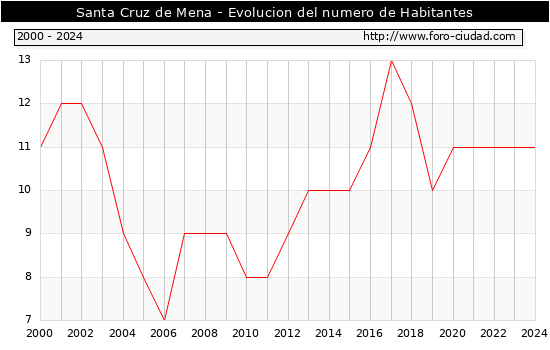 el numero de habitantes en Santa Cruz de Mena era de 11, igual numero de habitantes que el en el año 2023. En el grafico siguiente se puede ver cuantos habitantes tiene Santa Cruz de Mena a lo largo de los años.