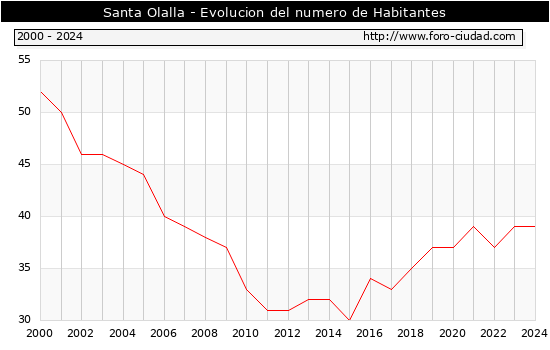 el numero de habitantes en Santa Olalla era de 39, igual numero de habitantes que el en el año 2023. En el grafico siguiente se puede ver cuantos habitantes tiene Santa Olalla a lo largo de los años.