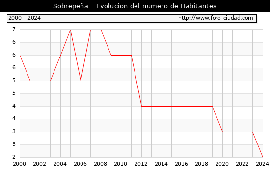 el numero de habitantes en Sobrepeña era de 2, 1 habitantes menos que el en el año 2023. En el grafico siguiente se puede ver cuantos habitantes tiene Sobrepeña a lo largo de los años.