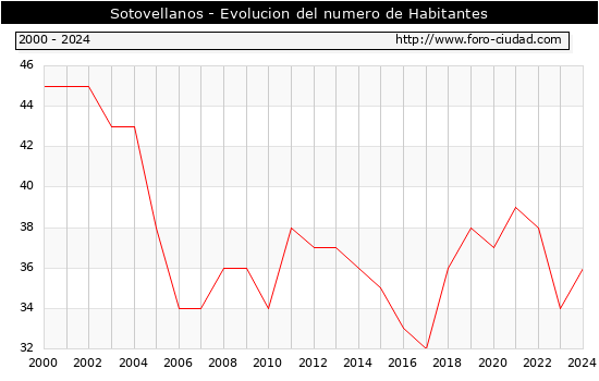 el numero de habitantes en Sotovellanos era de 36, 2 habitantes mas que el en el año 2023. En el grafico siguiente se puede ver cuantos habitantes tiene Sotovellanos a lo largo de los años.