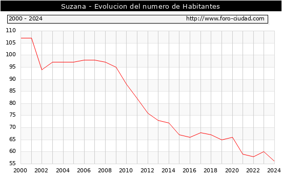 el numero de habitantes en Suzana era de 56, 4 habitantes menos que el en el año 2023. En el grafico siguiente se puede ver cuantos habitantes tiene Suzana a lo largo de los años.