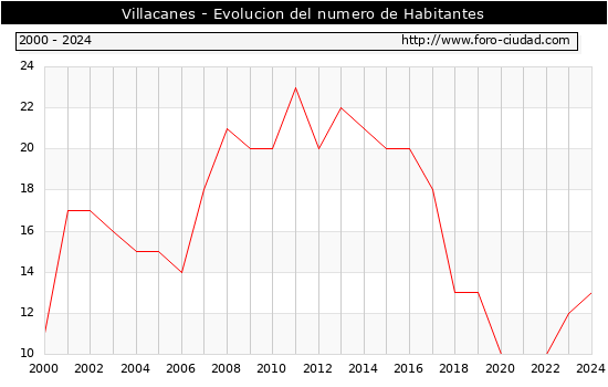 el numero de habitantes en Villacanes era de 13, 1 habitantes mas que el en el año 2023. En el grafico siguiente se puede ver cuantos habitantes tiene Villacanes a lo largo de los años.
